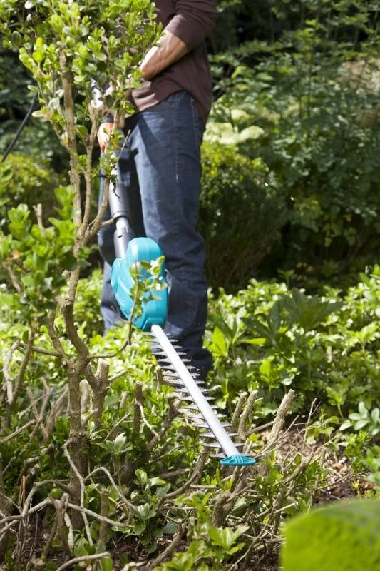 Zelfs als je geen ladder hebt kun je met deze uitschuifbare telescopische heggenschaar THS 500/48 van Gardena moeiteloos hoge heggen snoeien. De kop is kantelbaar zodat je ook de bovenkant van de heg goed kunt snoeien. Ook voor bodembedekkers laag bij de grond kun je deze heggenschaar prima gebruiken: je hoeft niet te bukken waardoor je je rug spaart!