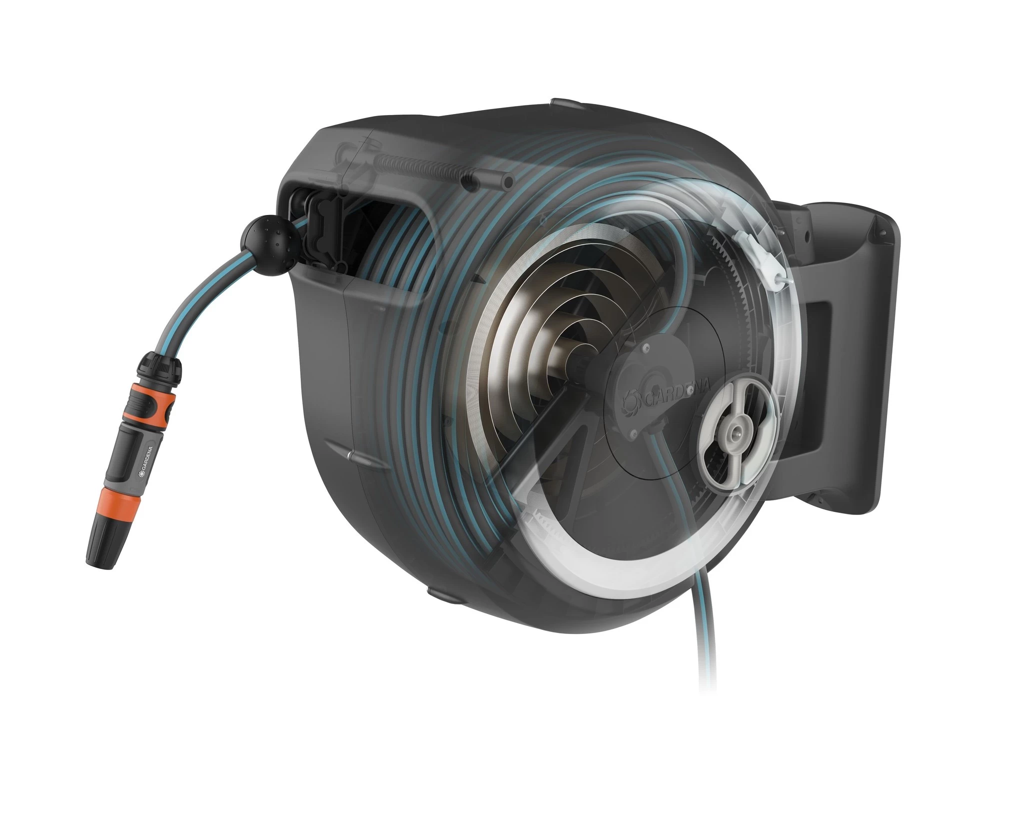 De slang trek je eenvoudig naar buiten om te gaan bewaren, vervolgens wordt hij automatisch op de gewenste lengte vastgezet wanneer u stopt dankzij de bijzonder korte vergrendelingspunten. Zodra het bewater klaar is trek je voorzichtig aan het eind van de slang en de slang trekt zich automatisch weer terug dankzij de geïntegreerde veer. Door de innovatieve RollControll-technologie gaat het oprollen veilig en gecontroleerd. De geïntegreerde slanggeleider zorgt ervoor dat de slang gelijkmatig wordt opgerold zonder dat hij in de knoop raakt.