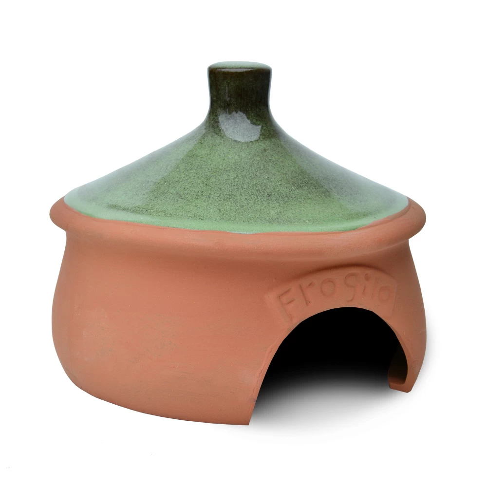 Dit kikker- en paddenhuis is gemaakt om ze te beschermen tegen roofdieren of om te overwinteren. Het is een handgemaakt keramiek huisje heeft een groen geglazuurde dak wat lijkt op een “Tajine”. Wat is de beste positie: Het huisje kan het beste in de buurt van een vijver of vochtige plek staan. Het liefst in een schaduwrijke omgeving, het dient er rustig en koel te zijn. Voor in de zomer kan er een gedeelte uit de onderkant gehaald worden zodat er contact gemaakt kan worden met de (verkoelende) bodem. Voor de winter geeft de keramische plank juist warmte en zal het gebruikt worden als over-winterings huis voor padden en vrouwelijke kikkers. De Frogilo kan bedekt worden met extra vegetatie om extra warmte te bieden. Verder is er geen enkel onderhoud nodig.