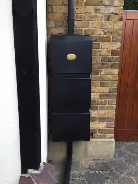• Geen geknoei bij het water geven. • De kraan kan aan beide kanten worden gemonteerd. • Minder bukken om de gieter te vullen. • Zuinig met de kostbare natuurlijke bronnen en daarom zuinig voor de portemonnee. • Kan 100 liter zuiver regenwater bevatten. • Kan gebruikt worden als verdeelpunt om water naar andere grotere tanks te verdelen. Past op alle ronde of vierkante regenpijpen (tot 80 mm Ø) • Kan op diverse manieren op de regenpijp worden gemonteerd. • Vult automatisch en verdeelt het overtollige water ook weer automatisch. • Uit te breiden met meerdere regentonnen door gebruik van een ¾” koppel-kit, gratis bij bestelling van 2 units. Zie afbeelding hierboven van ¾” koppel- kit • Maten: L 122 cm(H) x 46cm (Br) x 23 cm (D) • Eenvoudig en snel te installeren. Made in het VK uit gerecycled plastic.