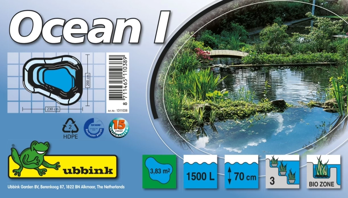 De voorgevormde vijver Ocean I van Ubbink is verkrijgbaar in twee verschillende uitvoeringen met een inhoud van maar liefst 1500 en 2000 liter. Hierdoor kunt u genieten van rondzwemmende vissen, mooie vijverplanten en de ontspannen sfeer die een vijver met zich meebrengt. Ocean I is een voorgevormde vijver die eenvoudig te plaatsen is in uw tuin. Een sfeervolle toevoeging op uw tuin die zorgt voor een oase van rust en levendigheid! De Ubbink Ocean I gemaakt van polyethyleen en vervaardigd door middel van de gebruikelijke dieptrektechniek. Het stevige materiaal polyethyleen is bestand tegen UV-straling en vorst en vriendelijk voor zowel het milieu als planten en dieren.